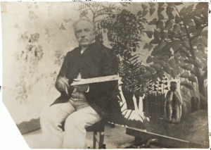 [ROUSSEAU Henri], Photographe non identifié Henri Rousseau, dit Le Douanier Rousseau, dans son atelier palette à la main devant une de ses toiles c. 1900. Épreuve d’époque sur papier citrate. Légende au verso: «Henry Rousseau, Le...