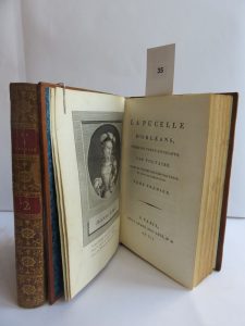 2 volumes in-8°, reliure d'époque en pleine basane racinée, dos lisses ornés, pièces de titre et de tomaison en papier rouge. Epidermures le long des plats sur les 2 volumes; reliure solide et correcte; 2 petites mouillures très marginales. Bonne impression sur papier fort. Collationné et complet XIII pp.- 223 pp./ 243 pp. Ouvrage divisé en 21 chants avec pour chaque, une gravure, soit 21 planches hors-texte gravées par Ponge. 1 portrait de Jeanne d'arc en frontispice du tome 1. Jolies planches, bonne édition peu courante.