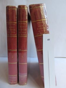3 volumes in-4°, reliure bradel papier, dos lisses, titre et tomaison dorés. Frottements d'usage, deux ou trois coins émoussés, mors du premier volume en partie fendu. Tome 1, 211 pages-180 gravures. Correspond aux peuples idolâtres : Inde, Siam, Tibet, Java, Chine, Japon, Tonkin, Laponie, Afrique.Tome2, 172 pages- 68 gravures. Correspond aux peuples idolâtres : Amérique Nord et Sud, Tahiti, mers du Sud.Tome 3, 159 pages-47 gravures. Correspond aux grecs et aux protestants : Grecs et Protestants.Série incomplète, manque tomes 4, 5 et 6. Pour information, les volumes 4, 5 et 6 contiennent : Vol.4 : Musulmans, Quakers, Déistes et Sectes diverses. Vol. 5: Juifs, Chrétiens, Catholiques et Romains. Vol.6, comprend les chapitres suivants: mascarades, danses, sectes et assemblées fanatiques, processions, sorciers, et franc-maçonnerie.Corps d'ouvrage propre malgré quelques rousseurs. Gravures bien imprimées avec un beau contraste.