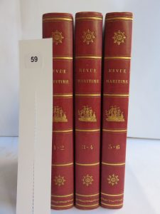 6 semestres reliés en 3 volumes in-8° en demi-veau bordeaux, dos lisses avec fers maritimes dorés. Très jolie reliure pastiche. Tête de collection, 28 planches gravées ou lithographiées, aucune rousseur, corps d'ouvrage très propre.