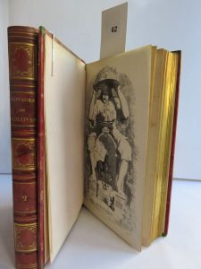 Première édition. 2 volumes in-8°, reliure d'époque en demi-veau glacé cerise, dos à nerfs ornés, titre et tomaison dorés, toutes tranches dorées. Une petite décoloration des dos par endroits et quelques rousseurs éparses. LXIX pp-219 pp / 319 pp.1 frontispice sur Chine, 450 vignettes et 4 frontispices par Grandville. Bon exemplaire.