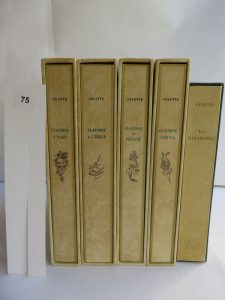 4 volumes brochés in-8°, couvertures rempliées sous papier cristal, avec chemises et étuis. Ouvrages tirés à 1800 exemplaires, ceux-ci portent le n°267. Les illustrations couleur ou noir et blanc sont de Renée Ringel. Série complète en bel état. On joint du même auteur « La vagabonde » aux éditions du livre Monte-Carlo, 1950, 1 volume petit in-8° broché, couverture rempliée avec étui et chemise. Ouvrage tiré à 3500 exemplaires, celui-ci porte le n° 2548, illustré de lithographies couleurs par Grau Sala. Bel exemplaire.