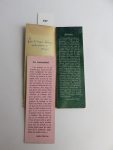 Petite plaquette de 22 x 6 cm en feuilles, soit 7 feuillets de couleur, plus un double feuillet en noir. Reprise d'extraits de textes d' André Breton, de Benjamin Perret etc? pour décrire l'univers de la Peintre lors de son exposition à la galerie Furstenberg du 30 avril au 17 mai 1958. Envoi signé de Toyen à Jacques Lévèque sur le contreplat de couverture. Bon exemplaire très frais.