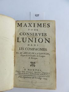 Gibonais (Arthur de la, doyen de la chambre des comptes de Bretagne) Maximes pour conserver l'union dans les compagnies. A Nantes, chez la veuve d'André Querro, 1714