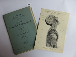 Ensemble de 11 fascicules en chemises vertes usagées comprenant 242 planches en héliotypies de l'anatomie humaine. La collation est la suivante.Fascicule 1 : 24 planches numérotées de 1 à 24, fascicule 2 : 24 planches numérotées de 1 à 24, fascicule 3 : 24 planches numérotées de 1 à 24, fascicule 4 : 20 planches numérotées de 1 à 20, fascicule 4 bis : 19 planches numérotées de 21 à 39, fascicule 5 : 24 planches numérotées de 1 à 24, fascicule 5 bis : 25 planches numérotées de 25 à 49, fascicule 5 ter : 23 planches numérotées de 50 à 72, fascicule 5 quater : 11 planches numérotées de 73 à 83, fascicule 6 : 12 planches doubles numérotées de 1 à 12, fascicule 7 : 36 planches numérotées de 1 à 36. Il manque le fascicule 5 quinter qui doit comporter 26 planches. Les planches protégées par des serpentes et tirées sur papier fort sont sans rousseurs. Les planches de coupes du corps humain ont un rendu saisissant. Atlas très original basé sur le sectionnement des cadavres en fines tranches permettant une vision proche de celle d'un scanner d'aujourd'hui. Rare ensemble presque complet.