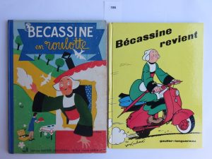 Edition Originale. Dernier album dessiné par Pinchon. Coins émoussés, bords partiellement frottés, dos en très bel état, plats légèrement salis avec quelques griffures, très bel intérieur bien relié - TB (on joint Bécassine revient EO 1959 premier album dessiné par Jean Trubert, TB état)
