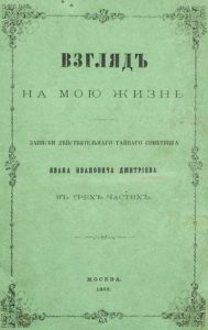 Взгляд на мою жизнь : Записки действительного тайного советника Ивана Ивановича Дмитриева: В 3-х ч. /[Предисл.: Мих. Дмитриев; Общ. примечания ко всем 3 ч. сост. М.Н. Лонгиновым].