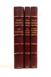 DORGELÈS (Roland). Les Croix de bois. Paris, La Banderole, 1921. — La Boule de gui. Paris, La Banderole, 1922. — Le Cabaret de la belle femme. Paris, Émile-Paul frères, 1924. Ensemble 3 volumes in-4, maroquin bordeaux janséniste, filets...