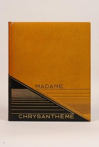 LOTI (Pierre). Madame Chrysanthème. Paris, Éditions Excelsior, 1926. In-4, maroquin bicolore, moutarde et noir, plat supérieur orné de jeux de filets noirs sur la partie moutarde et or sur la partie noire avec le titre, décor simplifié sur le...