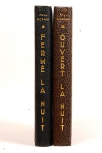MORAND (Paul). Ouvert la nuit. Paris, NRF, 1924. — Fermé la nuit. Ibid., id., 1925. Ensemble 2 volumes in-8, demi-maroquin vert foncé ou bleu, dos lisse, doubles gardes, tranches dorées sur témoins, couverture et dos, étui (Reliure de l'époque).