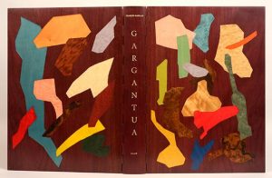RABELAIS (François). Gargantua. S.l., Les Bibliophiles de Provence, 1955. Grand in-4, reliure bois d'amarante, avec charnières ouvrant sur l'arrière, grand décor sur les deux plats par incrustation de différents bois naturels et teintés, dos...
