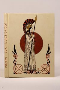 RENAN (Ernest). Prière sur l'Acropole. Paris, Pelletan, 1899. In-4, plein parchemin peint par Bellery-Desfontaines, sur le premier plat portrait en pied d'Athéna guerrière signé du monogramme de l'artiste, sur le second plat serpent déroulant...