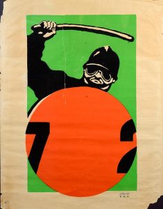 75 x 68 cm. Sérigraphie au pochoir bleu foncé sur fond vert, bouclier orangé. Atelier F. A. P. Déchirure centrale et aux angles. Très rare.