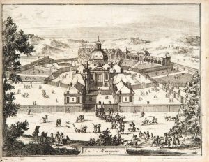 Jolie illustration gravée sur cuivre comprenant une vignette allégorique sur le titre par Adriaan Schoonebeek et 16 figures hors texte, dont 5 vues dépliantes et 11 planches contenant chacune deux sujets, montrant le palais, les jardins, les fontaines, les bosquets, etc.