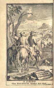Beau frontispice gravé sur cuivre par Jan Goeree montrant trois cavaliers se dirigeant vers un village situé au loin.