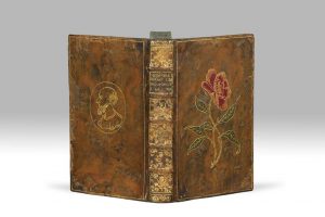 In-8, veau marbré, filet doré, sur le premier plat grande fleur dessinée au trait doré à feuilles et pétales mosaïqués de maroquin rouge et vert, sur le second, dessiné au trait doré, médaillon contenant le portrait d'un homme barbu et presque chauve, dos orné, tranches marbrées (Reliure de l'époque).