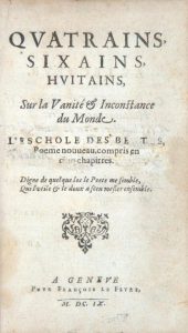 QUATRAINS, sixains, huitains. Sur la Vanité & Inconstance du Monde. Genève, pour François Le Fèvre, 1609.