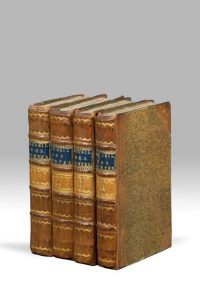 4 volumes in-18, demi-veau fauve avec coins, dos orné, nerfs bordés par une guirlande de festons, pièces de titre bleue et de tomaison citron, non rogné, chemise et étui demi-maroquin brun modernes (Reliure suisse de l'époque).