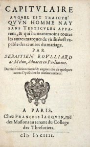 ROUILLARD (Sébastien). Capitulaire auquel est traicté qu'un homme nay sans Testicules apparens, & qui ha neantmoins toutes les autres marques de virilité : est capable des œuvres du mariage. Paris, Jacquin, 1604.