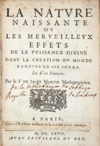 SAINT-MARTIN (Marc de). La Nature naissante ou les merveilleux effets de la puissance divine dans la creation du monde achevee en six jours. Paris, De l'Imprimerie de Vincent du Moutier, 1667. –