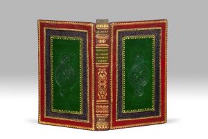 In-8, maroquin rouge, roulettes dorées et bordure de veau violet estampée à froid encadrant un panneau de maroquin vert, cartouche central bilobé à décor de rosace, dos lisse orné, roulette intérieure, tranches dorées (Reliure de l'époque).
