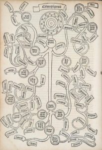 Rare édition, illustrée de 13 tableaux généalogiques représentant, à la manière médiévale, les arbres généalogiques des dieux et des héros. Ils sont repris sur ceux de l’édition de Venise, Locatelli, 1498.