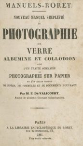 MANUELS RORET{CR}Nouveau manuel simplifié de photographie sur verre, albumine et collodion.{CR}Par M. E. de Valicourt. {CR}A la librairie encyclopédique de Roret, Paris, 1861.