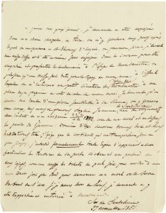 Dispositions testamentaires. 27 novembre 1851. « À peine mes yeux fermés, je demande à être déposée dans ma chère chapelle, à terre, on m’y gardera deux jours après lesquels on me portera à St Thomas d’Aquin, où pour mon service je demande une messe basse et d’être le même jour déposée dans le caveau pour être emportée et présentée le lendemain à l’église de Montmartre, où je désire qu’une messe soit dite pour le repos de mon âme, à l’issue de laquelle on m’enterrera au petit cimetière de l’église de Montmartre, à ma place déjà préparée à côté de celle de mon mari »… Suivent des instructions pour la gravure de la pierre tombale, et l’interdiction de « toute espèce d’appareil »… 4 avril 1854. Elle indiquera ailleurs la destination des objets de sa chapelle ; quant aux murs, croisées, corniche et plafond, elle demande qu’« on détruise jusqu’au moindre vestige de l’ornementation actuelle »… – Dons : « Au P. Lacordaire, le tableau de Chalais » ; d’autres articles d’argenterie et peintures sont légués à Raymond, M. de Mesnard, Caroline, etc. – Legs de titres financiers avec le nom de l’héritier laissé en blanc, et instructions concernant le comte de Ségur et M. de Saint-Aulaire…