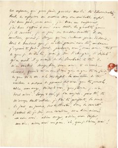 Belle correspondance amoureuse avec Caroline Bazile, dite Bazire, sa maîtresse et la mère de ses enfants. 1813. Dresde 12 août, il lui annonce son retour pour le 20 ou 21 : « Adieu, ange à moi ; je vais donc bientôt te presser contre mon cœur ! » Bordeaux 11 septembre 1813. Il s’inquiète d’une éventuelle grossesse : « As-tu encore des craintes ? Est-ce venu ? N’ai-je fait, oui ou non quelque sottise ? »… Il joue tous les deux jours mais s’ennuie : « Je meurs de consomption ; je ne sais pas si je pourrai tenir à deux mois d’absence ». Il est rongé par la jalousie, il la voit dans les bras d’un autre, et il pense à cet enfant à venir : « toutes ces réflexions me mettent dans un véritable enfer. [...] Trésor à moi, que jamais je n’ai tant aimé ! Songes à moi, je t’en conjure. Pour toi, tu m’occupes toute entière. Je t’ai là présente la nuit, le jour, en jouant, sur le théâtre, dans la société, partout où je suis, ma Caroline, ma bien aimée est avec moi. Adieu ange, adieu trésor, ma vie »... Bordeaux 17 septembre. Toujours en proie à la jalousie, il redoute la visite qu’elle attend de M. Clément (père du premier enfant de Caroline) ; il lui reproche de tarder à le rejoindre, et se réjouit de son éventuelle paternité : « Ton cœur, n’est-ce-pas, te parlera pour moi aussi bien que ce petit être, s’il existe, qui est en toi pour me défendre et qui doit, du moins à mes yeux, rendre à jamais nos liens indissolubles et sacrés. Chère amie, que les petites souffrances qu’il te prépare ne te rendent pas importuns mon bonheur et ma joie. [...] Tu es pour moi plus que mon amie, plus que ma maîtresse, tu es comme moi-même, je te regarde désormais comme la compagne de ma vie [...] Je ne cesse en esprit de t’accabler de baisers à tous les moments du jour, la nuit je t’en couvre aussitôt et toutes les fois que je m’éveille. Ces baisers imaginaires me troublent comme s’ils étaient réels et que je te tinsse dans mes bras »... Nantes 22 octobre. Il s’inquiète d’être sans nouvelles et lui dit le bonheur que lui causent ses lettres : « j’y relis toutes les expressions de ton amour et je suis bientôt calmé. Mais, cher et unique bien de ma vie, multiplies les le plus que tu pourras, jusqu’à ce que nous soyons réunis. Ce n’est pas assez que tu m’ayes dit que tu m’aimais, il faut me le redire encore, et me le redire mille fois »... Il espère que son état de grossesse ne va pas la changer : « Tu ne dois voir dans cet événement qu’un plus doux avenir pour toi, tu n’y dois puiser qu’une plus grande certitude de mon éternel et inaltérable attachement pour toi. Cet enfant nous confond tous deux et ne fait plus qu’un seul être de toi et de moi. Je t’aimais avec ivresse [...] il s’est mêlé à ma tendresse pour toi je ne sais quel sentiment plus vif encore, plus grave et plus profond qui me fait te regarder comme un objet sacré pour moi. [...] Donnes moi ta bouche, tes lèvres, tout. Tiens je les accable de mes baisers ! Tes yeux, ton petit nez, je baise tout avec ivresse, avec ferveur ! »... Nantes 11 mai et 4 avril 1816. Il s’inquiète fort du petit Jules (né le 8 mai 1814) qui doit subir une opération pour des troubles urinaires : « J’ai craint qu’on ne blessât le gland [...] Je sais très bien qu’il est entre de bonnes mains, mais l’imagination a toujours des si et des mais à sa disposition. [...] Baises le bien et dis-lui que son bon papa va venir bientôt » ; mais il ne sait s’il pourra venir bientôt à Paris, il a joué Hector, Britannicus... On joint une L.A. de Talma à Sophie Gail, [28 novembre 1815] (3 p. in-8, adresse), au sujet de Caroline et du petit Jules que Talma a chassés de chez lui et dont Sophie Gail prend la défense : « Peu s’en faut en vérité que je n’abandonne toutes mes résolutions et que je ne coure la serrer dans mes bras. Mais, chère amie, il faut que ma raison vienne à mon aide ». Il jure qu’il n’a pas d’autre passion mais voit pour lui un triste avenir : « Je me vois bientôt vieillir, elle encore jeune et dans toute sa force [...] et puis je n’ai pas en elle cette confiance sans borne, sans laquelle je ne puis être heureux, et cependant, chère amie, je ne sais pas si je pourrai m’accoutumer à me passer d’elle. [...] Elle ne voit que de l’éloignement, de l’inconstance là où je souffre d’un cruel déchirement. [...] Dites-lui bien que je l’aime, que jamais elle ne sortira de mon cœur »... Reproduction page ci-contre