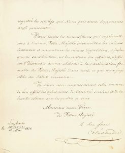 .. obtienne la bienveillance de sa Majesté pendant sa mission à Paris. « Votre Majesté connaît les principes qui ont guidé les Souverains dans les résolutions prises à Troppau et à Laybach. En Nous déclarant contre un système qui menaçait de consacrer le triomphe du crime et de rendre universel le désordre et dont le but est celui de précipiter dans une confusion épouvantable l’ordre moral et politique sur lequel reposent la société et la paix de l’Europe, [...] Nous combattions en même tems les ennemis de Votre Majesté, ceux du bonheur de son peuple et de la stabilité de son trône, et Nous comptons au nombre des plus grands avantages que Nous venons de remporter, celui d’avoir offert de nouveaux moyens au Gouvernement de Votre Majesté pour déjouer les complots qui se tramaient dans Son Royaume. Le salut de la France est identifié avec celui du monde. [...] Quant aux arrangements qui ont dû avoir lieu à la suite des événemens d’Italie [soulèvement du royaume de Naples et du Piémont], la sagesse de Votre Majesté n’y verra, sans doute, que des motifs de sécurité »... Durant les deux congrès de Troppau et Laybach, le concours de la France a été ardemment désiré, même s’ils ont respecté les causes qui l’ont empêchée d’y prendre une part plus directe : « nous avons regretté les motifs qui nous privaient d’un secours si puissant ». Il espère qu’à l’avenir aucun obstacle ne s’opposera « à la participation formelle de Votre Majesté dans tout ce qui sera jugé utile au salut commun »...