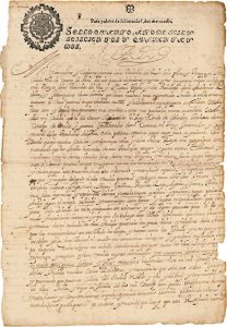 cachet fiscal et armes royales en tête ; en espagnol (fentes et bords effrangés).