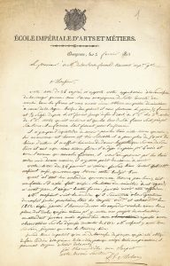 Rochefoucauld-Liancourt, inspecteur général des écoles d’arts et métiers ; 35 pages in-fol. ou in-4, qqs en-têtes École impériale d’Arts et Métiers aux armes impériales, École royale d’Arts et Métiers de Beaupréau ou Conservatoire royal des Arts et Métiers, qqs adresses, montées sur onglets et reliées en un volume in-fol., demi-vélin vert, pièce de titre au dos.
