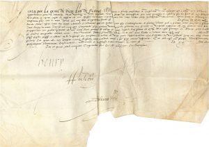 HENRI II (1519-1559) Roi de France. P.S., Joinville mars 1551 ; contresignée par Cosme Clausse, Nicolas Seguier et Philippe Hurault sur le repli ; vélin in-plano, fragment de sceau cire brune pendant sur cordelettes vertes et roses.