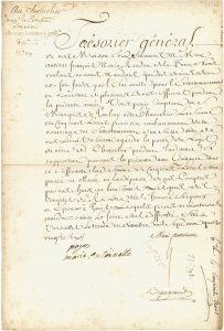 Ordre à Marc-Antoine-François-Marie Randon de La Tour, Trésorier général de la Maison de la Reine, de payer à son chancelier le marquis de Paulmy la somme de 500 livres, « pour son remboursement de la nourriture et entretennement d’un Suisse vêtu de nos livrées servant à garder la porte du logis de notre dit Chancelier »... La pièce porte la signature du secrétaire de la main « Marie Antoinette », puis est visée de la main de la Reine : « payez Marie Antoinette ».