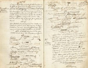 Saumur. Société littéraire. Registre manuscrit « servant aux délibérations de la Société Littéraire établie chez le Cn Cochard », signé par de nombreux sociétaires, dont plus de 40 membres fondateurs, 11 prairial IX (31 mai 1801)-28...