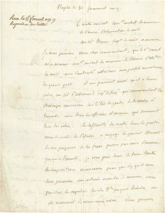 Silvestre de VILLENEUVE (1763-1806) vice-amiral, adversaire malheureux de Nelson à Aboukir et Trafalgar. L.A.S., Naples 30 germinal IX (20 avril 1801), au citoyen Étienne, capitaine de vaisseau à Ancône ; 2 pages et quart in-4.