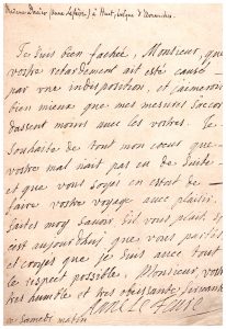 S’inquiétant de la santé de Pierre-Daniel Huet, Helléniste réputée de l’Académie française, futur évêque de Soisson pui d’Avranches ; Je suis bien fâchée, Monsieur, que vostre retardement ait esté causé par une indisposition (…) Je souhaite de tout mon cœur que vostre mal n’ait pas de suite et que vous soyés en estat de faire vostre voyage avec plaisir (…).