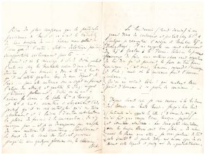 Très belle lettre sur l’interprétation de ses œuvres au piano ; Ah ! Ne craignez pas de ne pas rencontrer "la note" qu’il faut ! Ne savez-vous donc pas où est toute ma musique ? Mais je ne dois pas trop l’entendre – et contenir mon âme – jusqu’à l’écraser (…). Il remercie Clotilde pour son petit mot ; Elle a toujours de merveilleuse inspiration (…) Toute les notes m’en ravissent et me fascinent. Il n’est pas de chose triste, sotte, pitoyable, répulsive à laquelle elle ne prête un charme et un je ne sais quoi d’originalité savoureuse. De même que son visage, son parler ne ressemble à celui de personne. Qu’elle ne s’étonne donc pas qu’on soit insatiable de l’écouter (…). Il ajoute : Rien de plus saugrenu que la pastorale parisienne de Ma : si ce n’est la bestialité de son hors barrière de –. [sic] Gavons-nous autant de l’une que de l’autre. Sottise délétère par ici, insupportable avilissement par là… (…). Liszt fait part de ses discussions chez les Montebello au cours d’une soirée concernant la belle Mme de Mercy ; Mme de Mont[ebello] accentua si éloquemment l’adjectif qu’il ne me restait plus qu’à me taire absolument et à laisser à d’autres interlocuteur le plaisir de fournir à la conversation. On n’y manqua pas, et je ne désemparais pas non plus de mon mutisme de circonstance (…). Il fait part encore d’un grand dîner de cardinaux et prélats, et poursuit : Depuis samedi soir, je suis revenu à la Madonna del Rosario (…). Je n’ai fait que ranger livres, musiques, papiers… et attendre, attendre (…).