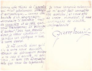Critique acerbe contre un journaliste : (…) Vous vous représentez les civilisations mortes – et le XIIIe s. français comme le IVe grec – avec des couleurs empruntées plutôt à votre imagination qu’à la réalité des "omnia quae supersunt". Avec la même imagination, vous combattez des idées qui ne sont pas les miennes et que vous m’attribuez, néanmoins, comme cette théorie de l’amoralité qui m’es absolument étrangère et antipathique ; comme cette boutade d’un personnage secondaire d’Aphrodite, trait de caractère et de rôle que vous transformez en principe d’auteur (…). Il n’y a entre nous aucun terrain de discussion (…).