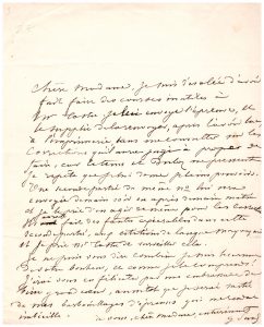 Correspondance de Sand au moment où elle rendait les épreuves d’une publication ; elle est désolée d’avoir fait faire des courses inutiles à M. Tastu. Je lui envoye l’épreuve et le supplie de la renvoyer, après l’avoir lue, à l’imprimerie, sans me consulter sur les corrections qu’il aura jugé à propos de faire, car le tems et Buloz me pressent. Une seconde partie de son manuscrit lui sera envoyée demain soir ou après-demain ; elle le prie de corriger les fautes exécrables de cette seconde partie et d’en surveiller l’impression. Elle ajoute à l’adresse de Mme Tastu : Je ne puis vous dire combien je suis heureuse de votre bonheur et comme je le comprends. J’irai vous féliciter par une embrassade de bien grand cœur, aussitôt que je serai sortie de mes barbouillages d’épreuves qui me rendent imbécille (…).