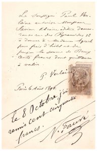 Quittance de Verlaine autorisant Savine, libraire éditeur demeurant rue des Pyramides, 12, de remettre 200 francs à madame Agrech pour frais d’hôtel et de pension (…).