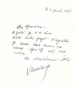 Maurice de VLAMINCK. 1876-1958. Artiste peintre.L.A.S. S.l., 2 janvier 1946. 1 pp. in-4.