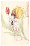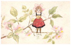 Rares dessins aquarellés de la jeune Valentine, à 15 ans, déjà prédisposée à l’art ; les 3 cartes qui font partie d’une série sur les fleurs, représentent de manière onirique des fillettes vivant dans des fleurs, deux sont accompagnés d’insectes.
