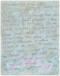 Minute d’une lettre de Valentine donnant ses impressions après le vernissage de l’exposition des œuvres de Marie-Laure de Noailles. Je suis allée tout à l’heure revoir non pas le dragon de la rue mais dans cette rue justement vos animaux si fantastiques (…). Je suis arrivée tôt et j’ai pu regarder tout à mon aise ceux de vos tableaux que j’aime le plus, me plaisent le plus, depuis le visage de bronze du "loup garou" et le maëlstrom de terreur de la tyrolienne tragique, jusqu’aux bêtes de "Vaccarès" qui se consument au soleil (…).