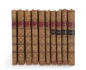 Soit 10 vol. petit in-8 (163x93 mm); veau havane Xixe, triple filet doré en encadrement sur les plats. Dos à nerfs orné. Filet sur les coupes. Tranches dorées Roulette intérieure. [Closs]