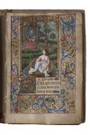 France, Champagne (?), vers 1475 86 ff., écriture gothique, initiales peintes, bordures enluminées, trois enluminures (repeints aux visages). Reliure vers 1900, tapisserie et velours avec galons dorés (Importantes mouillures; en partie dérelié). Dimensions: 182 x 127 mm.