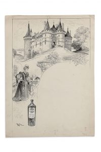 ROBIDA - Projet de menu. Dessin à l’encre de chine, représentant le château de Chaumont-sur-Loire et des personnages historiques.