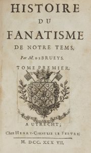 BRUEYS (David Augustin de). Histoire du fanatisme de notre tems. Utrecht [Paris] : HenryCorneille Le Febure, 1737. — 3 volumes in-12, portrait, xvj, lxxviij pp. mal chiffrées l, 386 pp., 1 planche ; (2 ff.), 410 pp., 1 planche ; (1 f.), pp....