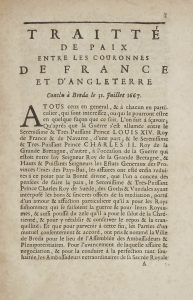 (reliure du XIXe siècle). Réimpression du traité signé à Bréda en Hollande le 31 juillet 1667, mettant fin à la seconde guerre anglo-hollandaise. Divisé en 20 articles, il spécifie notamment que la France rendra l’île de Saint-Christophe dans les Antilles aux Anglais, en échange de l’Acadie au Canada arrachée aux Français en 1654. À la suite du traité figurent le “Pouvoir des Ambassadeurs & Plénipotentiaires de France (et d’Angleterre)”, la “Ratification du Traité”, et l’ “Acte de la Publication faite à Breda. De par les Ambassadeurs Extraordinaires & Plenipotentiaires de France”. Cette publication en 1689 n’est sans doute pas anodine car elle intervient au début de la guerre de la ligue d’Augsbourg.