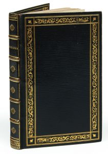 In-8. Plein maroquin bleu nuit à grain long, dos à petits nerfs orné de filets et fleurons dorés, dentelle dorée en encadrement sur les plats, doublure de gardes de moire blanche, tranches dorées, couverture muette de papier bleu (Reliure moderne).